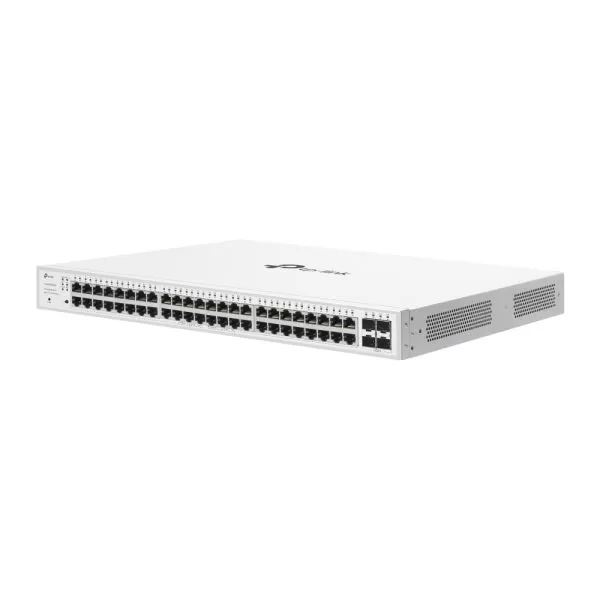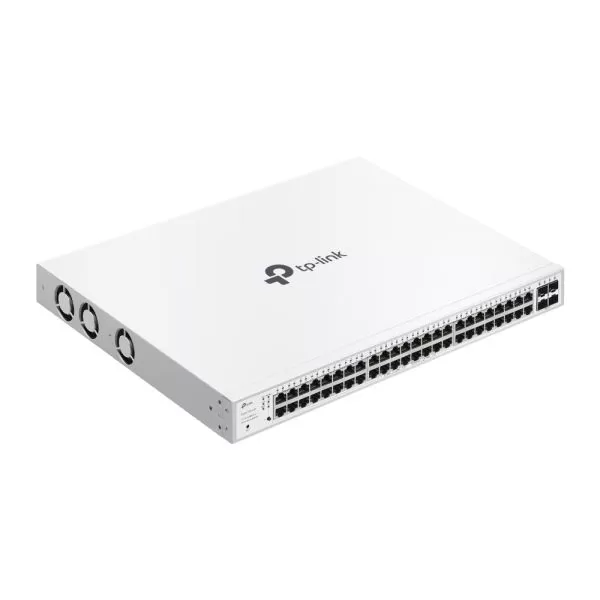 Switch TP-Link cu 52 de porturi, 48× 10/100/1000 Mbps PoE+ RJ45 Ports (Auto Negotiation/Auto MDI/MDIX),4× Gigabit SFP Slots, capacitate switch 104 Gbps, dimensiuni 17.3×13.0×1.7 in (440×330×44 mm)