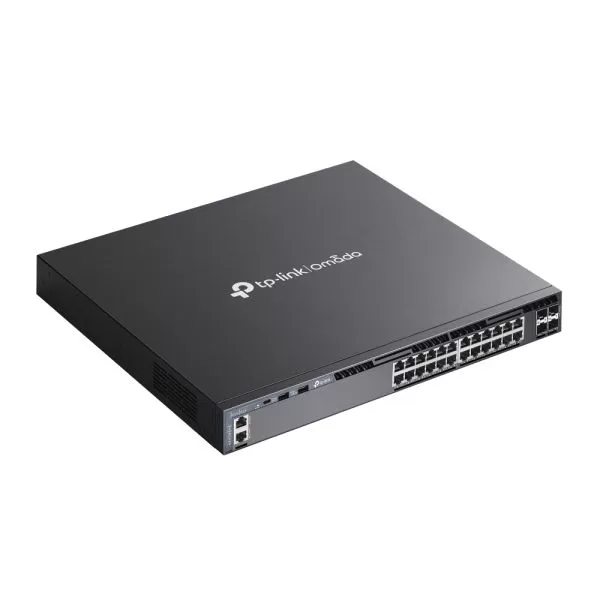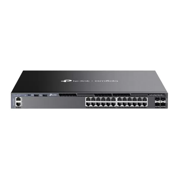 Omada 24-Port Gigabit Stackable L3 Managed Switch with 4 10GE SFP+ Slots PORT: 24× Gigabit RJ45 Ports, 4× 10G SFP+ Slots, RJ45/Type C USB Console Port, Management Port, 2× USB2.0 Ports SPEC: 1U 19-inch Rack-mountable Steel Case FEATURE: Integration with Omada SDN Controller, Stacking, RIP, OSPF, VRRP, ECMP, PIM-DM, Static Routing, DHCP Server, DHCP Relay, ERPS, RSPAN, QinQ, OAM, sFlow, DDM, 802.1Q VLAN, STP/RSTP/MSTP, IGMP Snooping, 802.1p/DSCP, QoS, ACL, 802.1x, Radius/Tacacs+ Authentication, LACP, CLI, SNMP, Dual Image/Configuration, IPv6, Dual Redundant Power Supplies