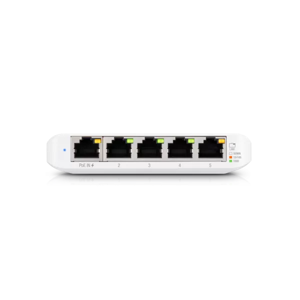Ubiquiti UniFi Switch, USW-FLEX MINI, 5x 10/100/1000 Mbps RJ45 Ports, 802.3af/at PoE (Pins 1, 2+; 3, 6-), USB Type C, 5V.