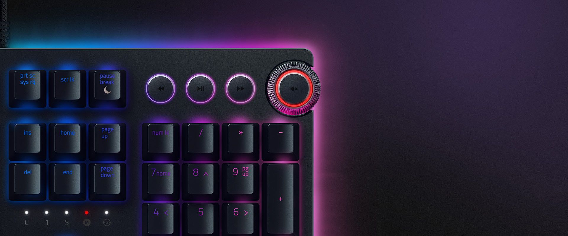 | DIALA DIGITALA MULTIFUNCTIONALA Controlul tastaturii a fost mult mai rapid. Un cadran digital multifunctional cu trei taste media tactile va ofera acces instantaneu la totul, de la luminozitate la volum in cateva secunde. Toate programabile si personalizabile prin Synapse 3 - astfel incat sa puteti seta configuratiile preferate chiar la indemana. |