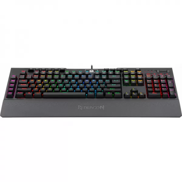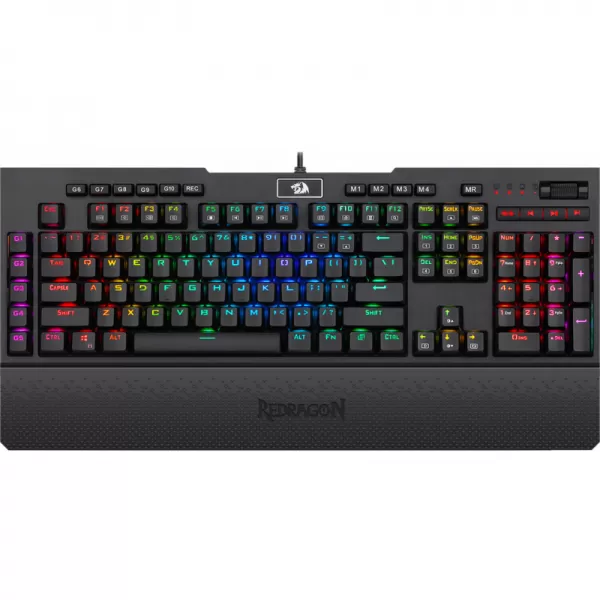 Tastatura gaming mecanica Redragon Brahma Pro iluminare RGB neagra, switch-uri optice albastre, toate tastele fara conflict (n-key rollover), iluminare LED RGB a tastelor (16.8 Millioane de culori disponibile, 18 moduri de iluminare, reglarea intensitatii), 12 taste multimedia, 9 taste programabile, palmrest detasabil, conector: USB