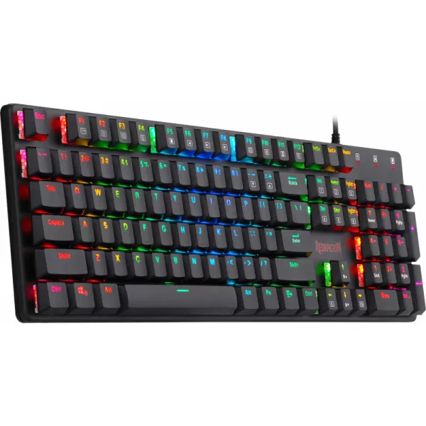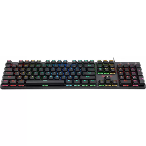 Tastatura gaming mecanica Redragon Shrapnel neagra iluminare RGB switch-uri albastre, toate tastele fara conflict (n-key rollover), constructie din aluminiu, taste low-profile, iluminare LED RGB a tastelor(12 moduri de iluminare, reglarea intensitatii), 8 taste multimedia, tasta WIN poate fi dezactivata in timpul jocurilor, 13 switch-uri de schimb, conector USB placat cu aur, USB, dimensiuni: 438x125x34mm