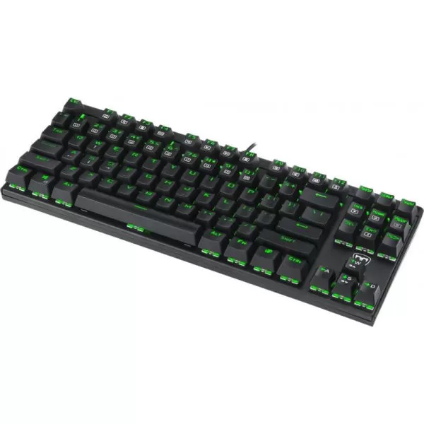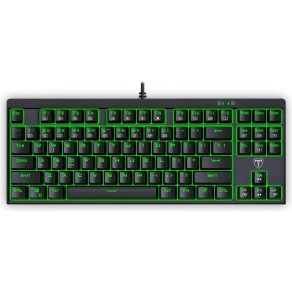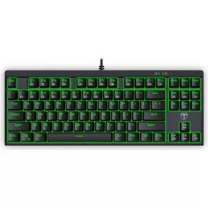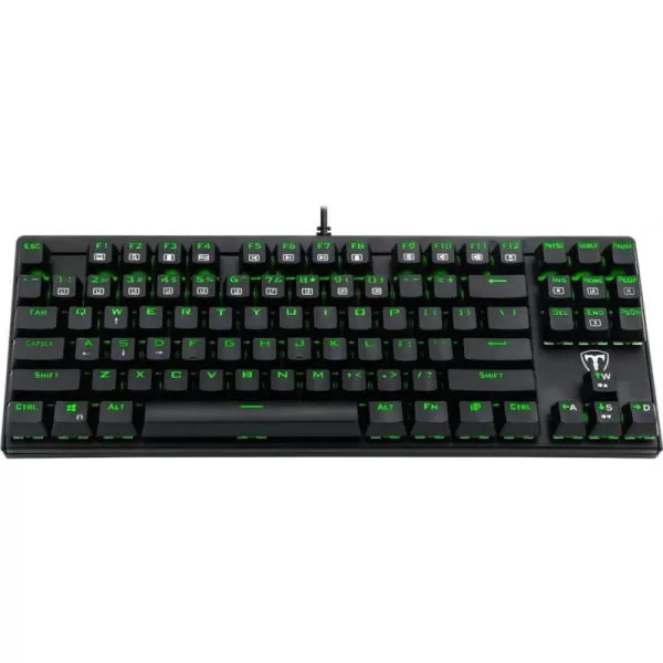 Tastatura gaming mecanica T-Dagger Corvette iluminare verde neagra, toate tastele fara conflict (n-key rollover), switch-uri albastre Outemu, iluminare LED verde a tastelor (reglarea intensitatii, posibilitatea iluminarii numai anumitor taste – 3 profile de iluminare), 8 taste multimedia, tasta WIN poate fi dezactivata in timpul jocurilor, taste durabile (double shot inject), conector USB placat cu aur, dimensiuni: 353x134x47mm
