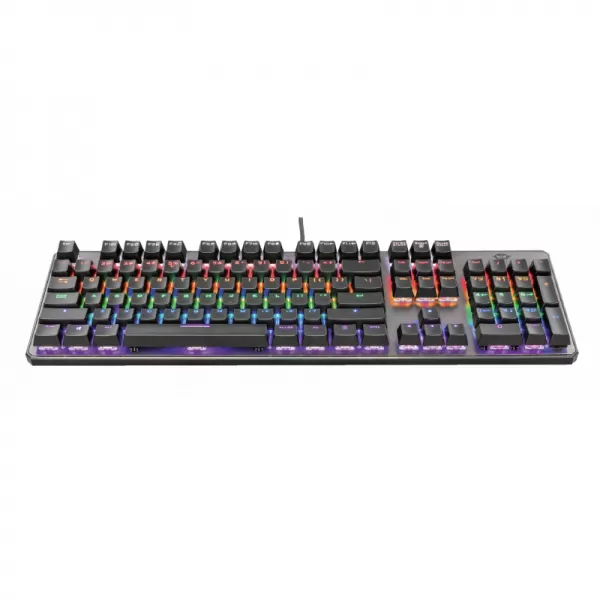 Tastatura Trust GXT 865 Asta Mechanical Gaming Keyboard Specifications General Key technology mechanical Height of main product (in mm) 444 mm Width of main product (in mm) 133 mm Depth of main product (in mm) 41 mm Total weight 1152 g Full Size keyboard yes Ergonomic design no Connectivity Connection type wired Cable length main cable 180 cm Bluetooth no USB version 2.0 Connector type USB Features Spill-proof no Silent keys no On-board memory no Wrist support no Software no Special features 6 color backlight (fixed colors each row). Gaming mode. Height adjustable (angle stands). Integrated keycap puller. Gaming Designed for gaming yes Gaming mode yes Lighting Backlight yes Backlight colours White Red Orange Green Blue Purple Key illumination yes Key colours White Red Orange Green Blue Purple Characteristics Keyboard layout QWERTY Input Power source USB Compatibility Compatible Device Types pc, laptop, gaming console Compatible Consoles PS4, Xbox One Compatible Software Platforms Windows, Mac OS, Chrome OS Control Numeric Key Pad yes Trackpad no Media keys 11 Macro keys no Programmable keys no Number of keys 104 Life time of key 50000000 presses Anti-Ghosting Yes Response time 1 ms Switch Brand Trust Travel distance 4 mm Operation force 65 g Macro programming no Switch Type Linear Trigger force 45 g Indicators Caps-lock, Num-lock, Scroll-lock Switch colours Red