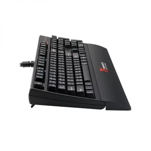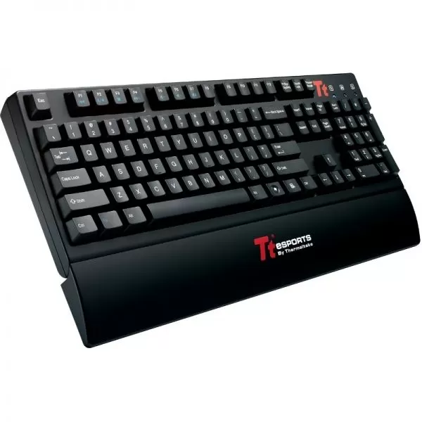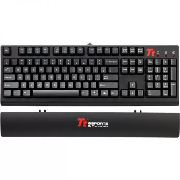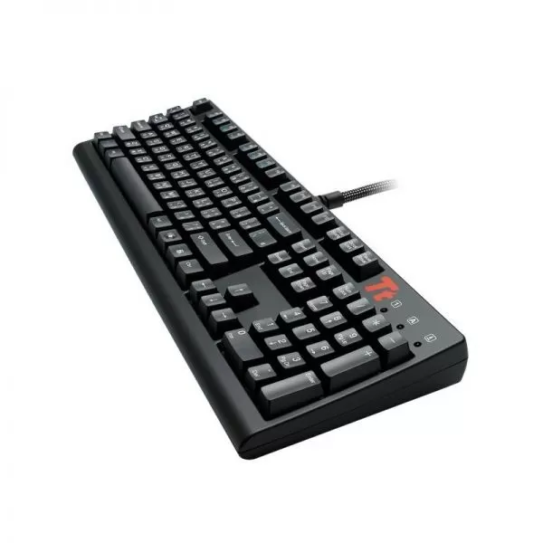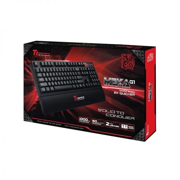 Tt eSPORTS MEKA G1, tastatura mecanica (switch-uri Cherry MX Black), polling rate de pana la 1000Hz (de pana la 8 ori mai rapid ca o tastatura normala), adaptor USB to PS2 pentru “N key rollover” (elimina complet ghosting-ul), jack-uri audio pentru casti si microfon, hub USB cu 2 porturi pentru periferice, palm rest detasabil, 7 taste multimedia, lungime cablu: 1.5m, conector USB placat cu aur, dimensiuni: 430 x 160 x 40mm, USB