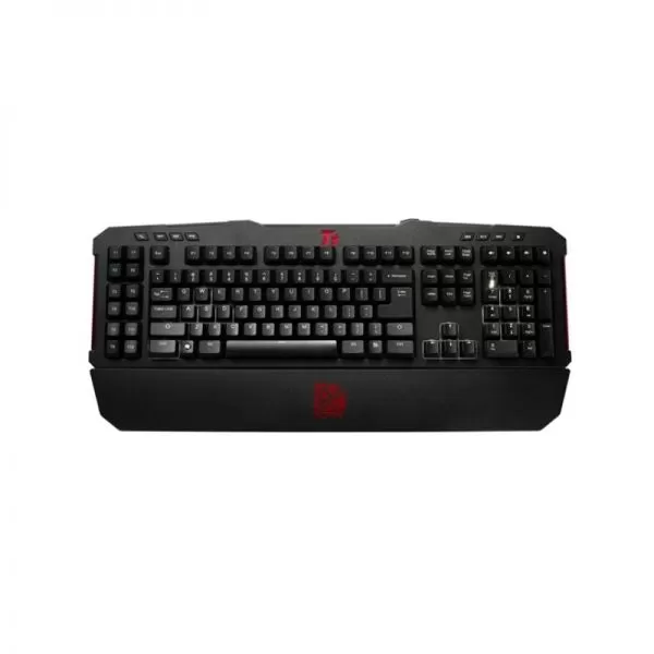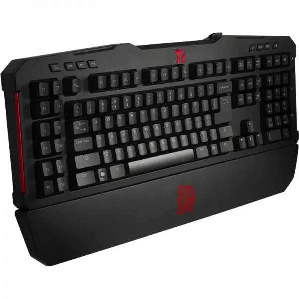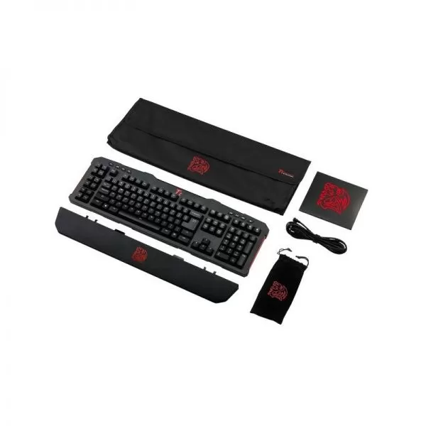 Tt eSPORTS MEKA G-Unit, iluminare LED pentru 3 sectiuni de taste (4 nivele de intensitate a luminii), tastatura mecanica (switch-uri Cherry MX Black), polling rate de pana la 1000Hz (de pana la 8 ori mai rapid fata de o tastatura normala), functie anti-ghosting pentru oricare 46 de taste, 64kb memorie on-board pentru stocarea a 60 de macro-uri in cadrul a 3 profile (profilele por fi schimbate direct de pe tastatura), jack-uri audio pentru casti si microfon, hub USB cu 2 porturi pentru periferice, buton “Normal Mode/Game Mode” - dezactiveaza tastele Windows, palm rest detasabil, 7 taste multimedia, cablu detasabil pentru un transport facil, lungime cablu: 2m, conector USB placat cu aur, dimensiuni: 553 x 271 x 70mm, USB