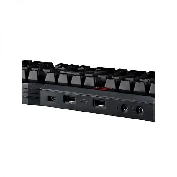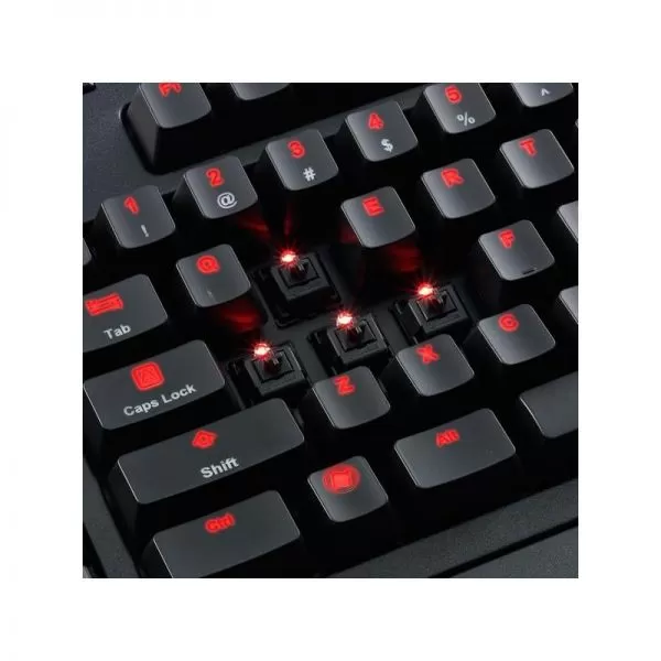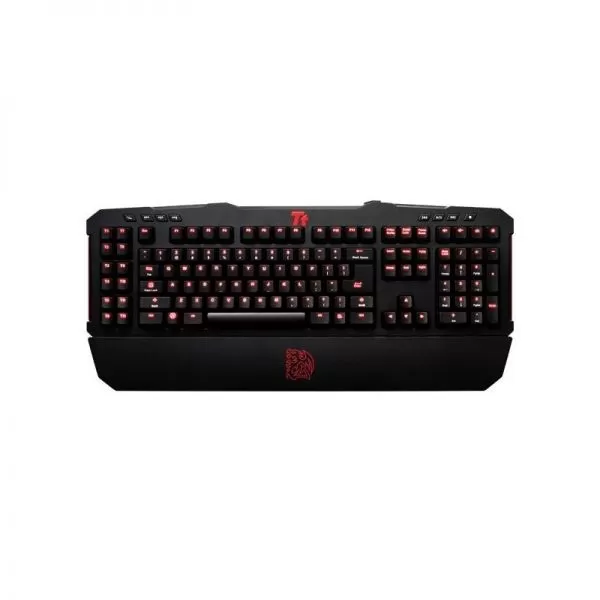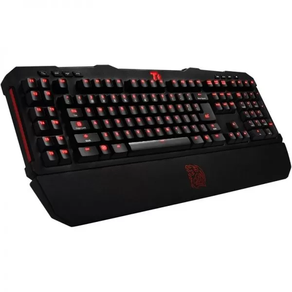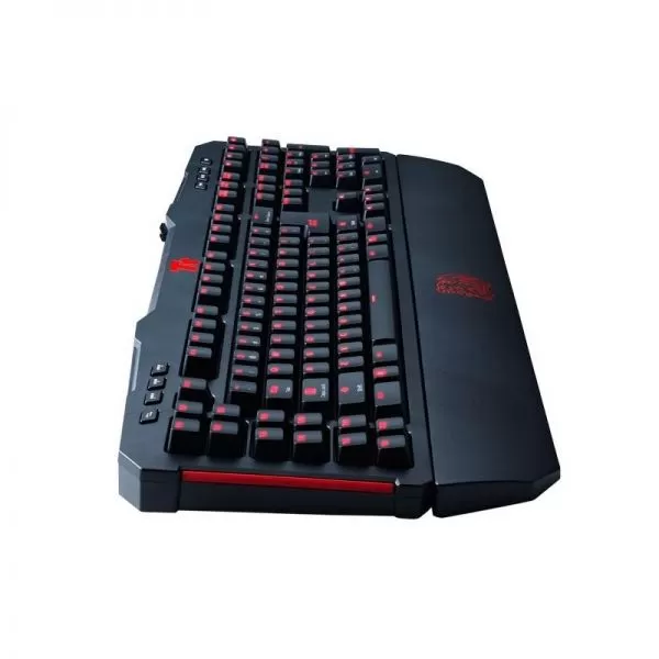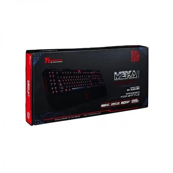 Tt eSPORTS MEKA G-Unit Illuminated, iluminare LED rosie a tastelor cu 4 nivele de intensitate, tastatura mecanica (switch-uri Cherry MX Black), polling rate de pana la 1000Hz (de pana la 8 ori mai rapid fata de o tastatura normala), 64kb memorie on-board pentru stocarea a 60 de macro-uri in cadrul a 3 profile (profilele por fi schimbate direct de pe tastatura), 12 taste macro, jack-uri audio pentru casti si microfon, hub USB cu 2 porturi pentru periferice, palm rest detasabil, 7 taste multimedia, buton “Normal Mode/Game Mode” - dezactiveaza tastele Windows, cablu detasabil pentru un transport facil, lungime cablu: 2m, conector USB placat cu aur, dimensiuni: 553 x 271 x 70mm, USB