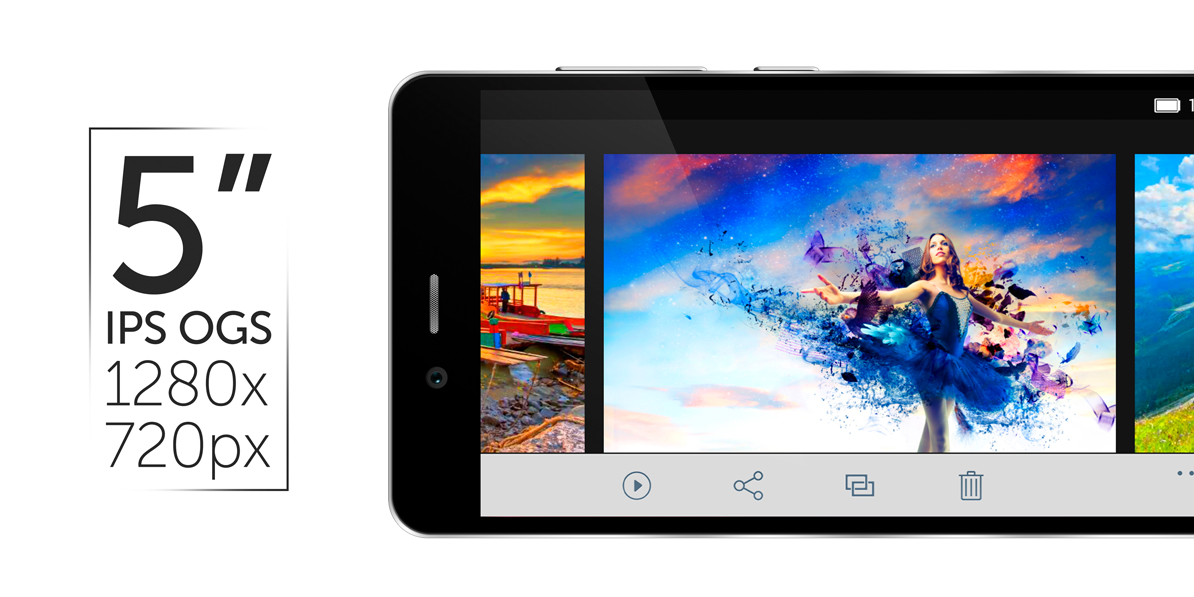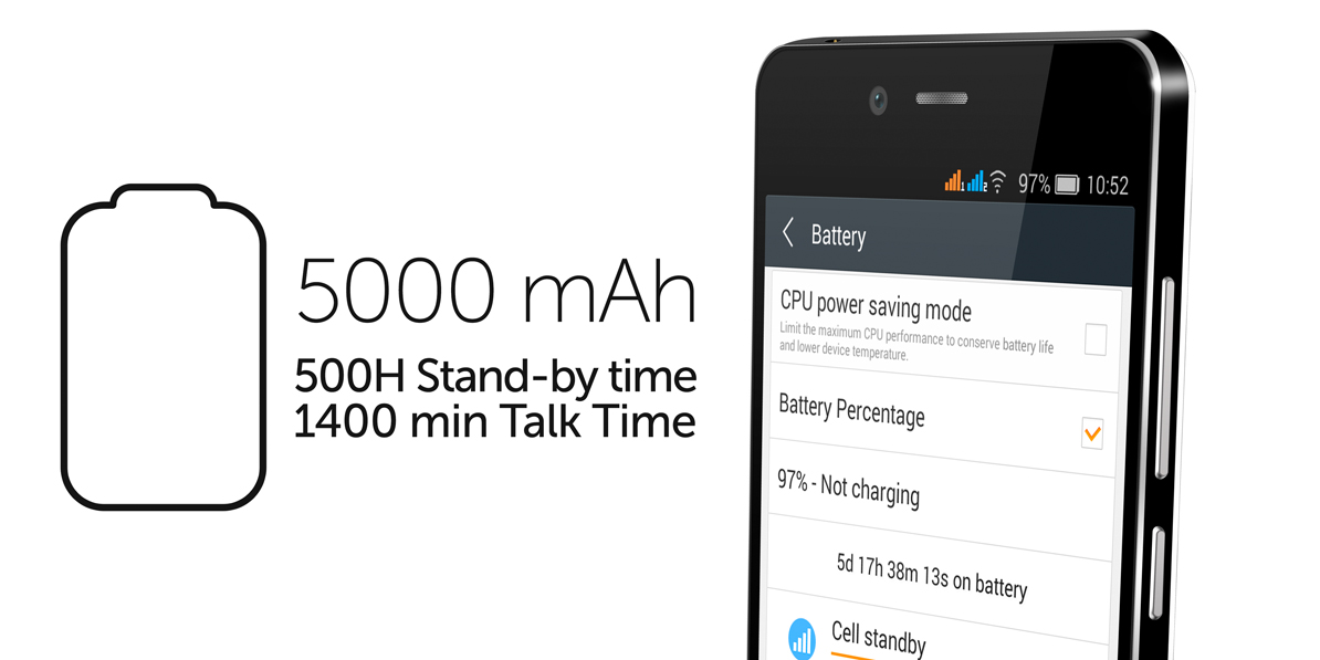 Cu toate ca are o baterie impresionant de mare telefonul are un design slim si se potriveste perfect intr-o atmosfera business. Display-ul IPS OGS de 5” protejat de sticla rezistenta la zgarieturi, este ideal pentru a putea vedea clar toate detaliile in culori patrunzatoare din aproape orice unghi. Mai mult, rezolutia de 1280x720 pixeli va asigura claritate fotografiilor si clip-urilor video, pentru ca tu sa te bucuri de detaliile imaginilor.