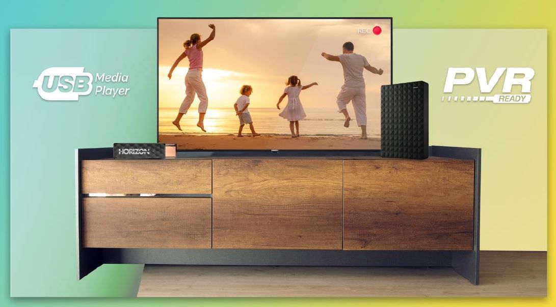 | PERSONAL VIDEO RECORDER (PVR). TIMPUL CAPATA O NOUA DIMENSIUNE! Uita de DVD-uri sau orice alte dispozitive de redare audio/video si profita acum de portul USB 2.0 din dotarea televizorului HORIZON. Poti inregistra emisiunile/filmele preferate folosindu-te de functia PVR integrata pe televizorul tau. Cu ajutorul portului USB 2.0, televizorul HORIZON te conecteaza la orice dispozitiv de stocare externa pentru ca tu sa accesezi continut digital (imagini, fisiere video si audio, de la filmele si muzica preferate, pana la pozele din vacanta). |
