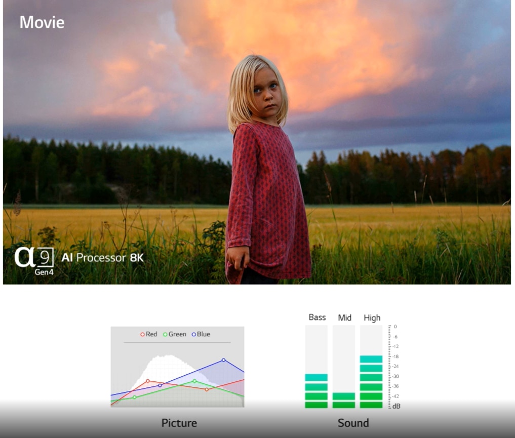 Procesor AI α9 Gen4 8K Procesor ce te va da pe spate La baza LG QNED MiniLED se afla α9 Gen4 AI Processor 8K, un cip revolutionar care foloseste algoritmi de invatare profunda pentru a analiza si optimiza continutul. Fiecare ajustare a imaginii si a sunetului este automata, deci tot ceea ce urmariti este spectaculos.
