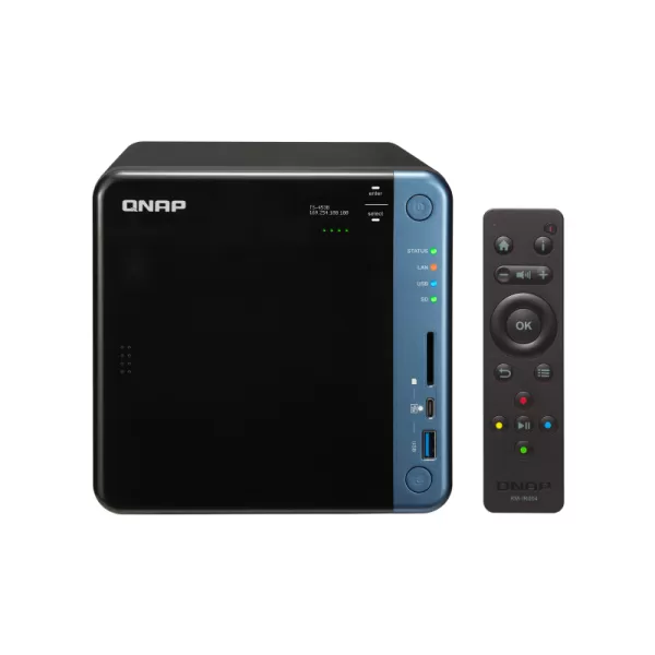 QNAP 4-Bay NAS, Intel Celeron J3455 quad-core 1.5GHz (up to 2.3GHz), 4GB DDR3L, SATA 6Gb/s, 2xGbE, PCIe slot for 10GbE or 2 more GbE, AES-NI encryption, 4K hardware transcoding, dual 4K HDMI v1.4b, OL