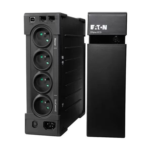 Eaton Ellipse ECO 800 USB FR (french), topologie Offline, functie EcoControl, 800 VA, 500 Watt, intrare IEC-C14, 4 iesiri Schuko (din care 3 cu backup prin baterie, 1 iesire PLC-ready), protectie linii de date RJ11 si RJ45, port USB pentru management, backup 11min@50%, 6min@70%